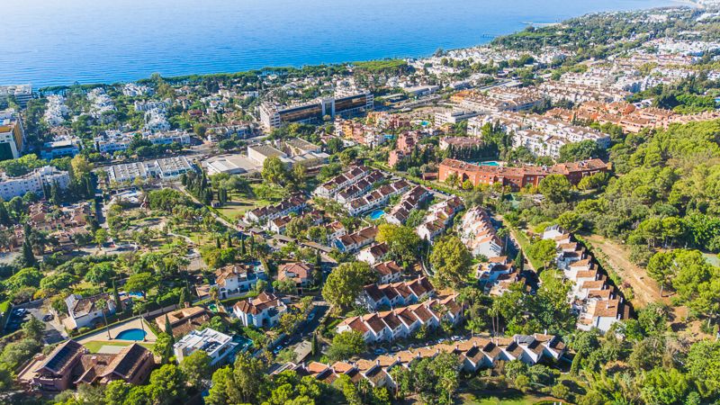 of El Capricho on Marbella’s Golden Mile, offering spacious tropical gardens and two communal